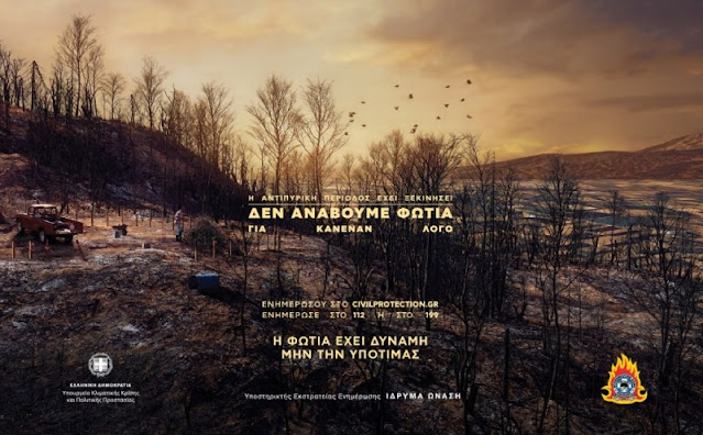 Με κεντρικό σύνθημα «Δεν ανάβουμε φωτιά για κανέναν λόγο», το υπουργείο Κλιματικής Κρίσης και Πολιτικής Προστασίας και το Πυροσβεστικό Σώμα παρουσιάζουν τα νέα τους ενημερωτικά spot (τηλεοπτικά και ραδιοφωνικά), στο πλαίσιο καμπάνιας ενημέρωσης και ευαισθητοποίησης, που πραγματοποιείται με την ευγενική υποστήριξη του Ιδρύματος Ωνάση.