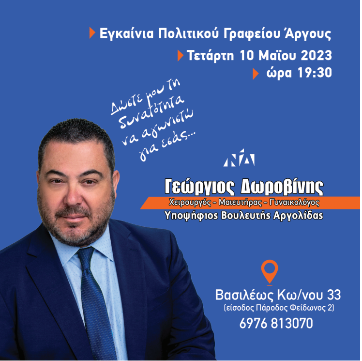 Ο υποψήφιος Βουλευτής Αργολίδας της Ν.Δ κ. Γεώργιος Δωροβίνης, Χειρουργός-Μαιευτήρας-Γυναικολόγος, σας προσκαλεί στα Εγκαίνια του Πολιτικού Γραφείου του στο Άργος που θα πραγματοποιηθούν την Τετάρτη 10 Μαΐου 2023 και ώρα 19.30, στην οδό Βασιλέως Κωνσταντίνου 33, με είσοδο από την πάροδο Φείδωνος 2.
