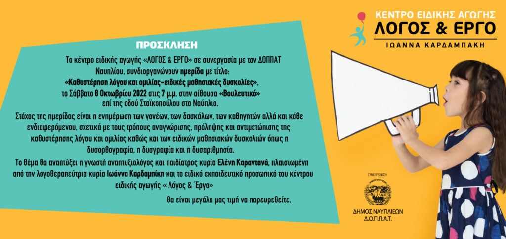 ο κέντρο ειδικής αγωγής «ΛΟΓΟΣ & ΕΡΓΟ» σε συνεργασία με τον ΔΟΠΠΑΤ Ναυπλίου, συνδιοργανώνουν ημερίδα με τίτλο: «Καθυστέρηση λόγου και ομιλίας-ειδικές μαθησιακές δυσκολίες», το Σάββατο 8 Οκτωβρίου 2022 στις 7 μ.μ. στην αίθουσα «Βουλευτικό» επί της οδού Σταϊκοπούλου στο Ναύπλιο.