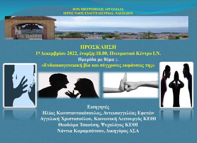 Η Ιερά Μητρόπολη Αργολίδας και ο Ι.Ν. Ευαγγελιστρίας Ναυπλίου διοργανώνουν την 1η Δεκεμβρίου 2022, με ώρα έναρξης στις 18.00 στο Πνευματικό Κέντρο του Ι.Ν., ημερίδα με θέμα :. «Ενδοοικογενειακή βία και σύγχρονες εκφάνσεις της»