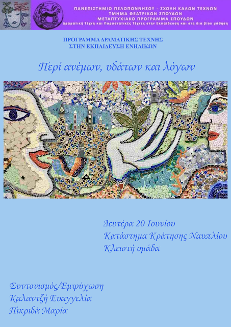 Το Μεταπτυχιακό Πρόγραμμα Σπουδών «Δραματική Τέχνη και Παραστατικές Τέχνες στην Εκπαίδευση και Δια Βίου Μάθηση» του Τμήματος Θεατρικών Σπουδών του Πανεπιστημίου Πελοποννήσου σε συνεργασία με το Κατάστημα Κράτησης Ναυπλίου διοργανώνουν το πρόγραμμα Δραματικής Τέχνης στην Εκπαίδευση με τίτλο: «Περί ανέμων, υδάτων και λόγων»