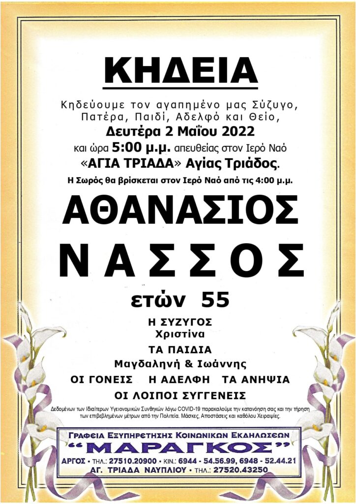 Θλίψη στην Αργολίδα από την απώλεια του Θανάση Νάσσου που έφυγε ξαφνικά, αναπάντεχα και τόσο νέος, από τη ζωή.