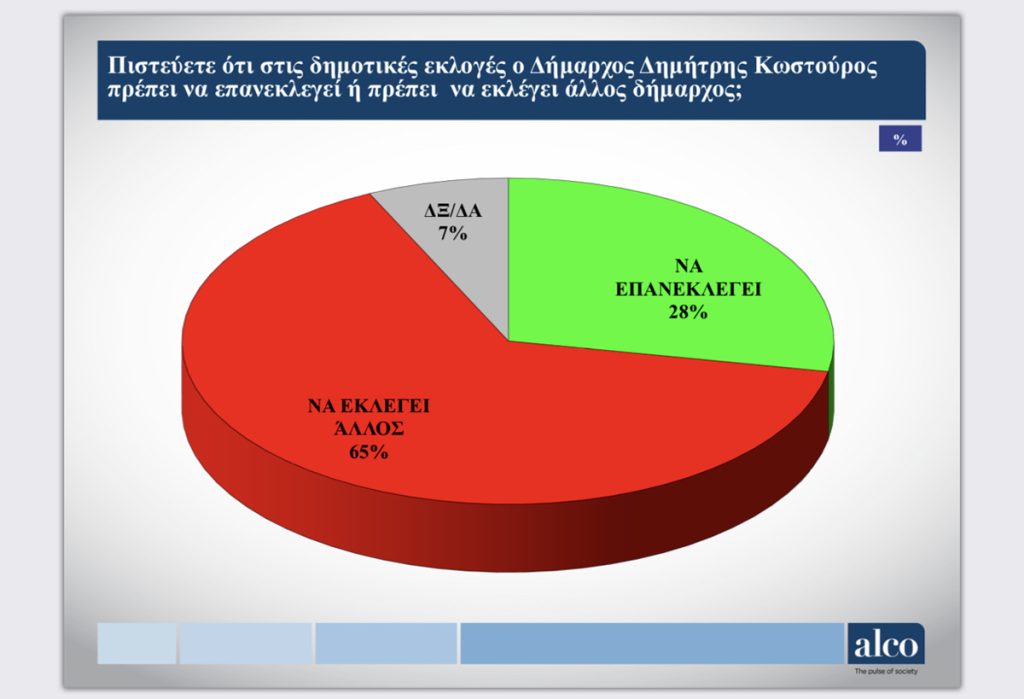 Στο ερώτημα «Πιστεύετε ότι στις δημοτικές εκλογές ο Δήμαρχος Δημήτρης Κωστούρος πρέπει να επανεκλεγεί ή πρέπει να εκλεγεί άλλος Δήμαρχος»; το 65% απαντά πως ο Δημήτρης Κωστούρος ΔΕΝ ΠΡΕΠΕΙ να εκλεγεί και πρέπει να εκλεγεί κάποιος άλλος. (Μόνο το 28% επιθυμεί την επανεκλογή του).