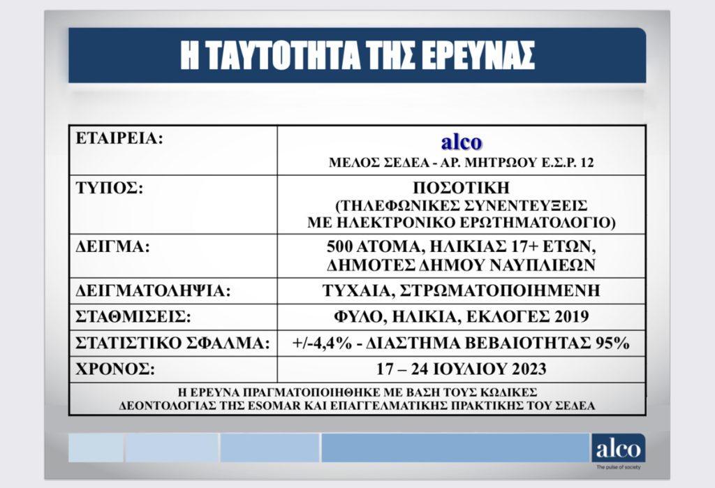Η πρόσφατη δημοσκόπηση που διενεργήθηκε στο Δήμο Ναυπλιέων (17-24 Ιουλίου) με θέμα τις δημοτικές εκλογές του Οκτωβρίου, από την έγκριτη εταιρεία ALCO, είναι ενδεικτική των τάσεων που επικρατούν σήμερα στους ψηφοφόρους του Δήμου Ναυπλιέων.