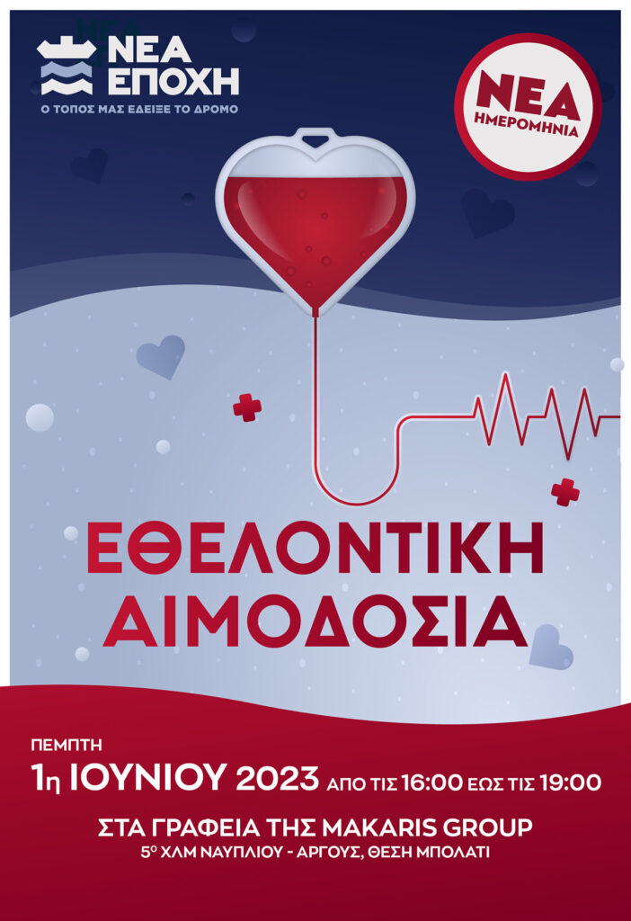 Η Αιμοδοσία θα γίνει με την επιστημονική επίβλεψη του αρμόδιου τμήματος του Γενικού Νοσοκομείου Αργολίδας, την Πέμπτη 1η Ιουνίου 2023, από τις 16.00 έως 19.00 στην αίθουσα της MAKARIS GROUP (5ο klm Ναυπλίου Άργους, στο Μπολάτι).