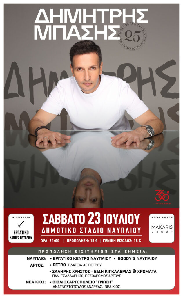 Η συναυλία με τον Δημήτρη Μπάση θα πραγματοποιηθεί στις 23 Ιουλίου 2022 ημέρα Σάββατο και ώρα 9.00μ.μ. στο Δημοτικό Αθλητικό Κέντρο Ναυπλίου.