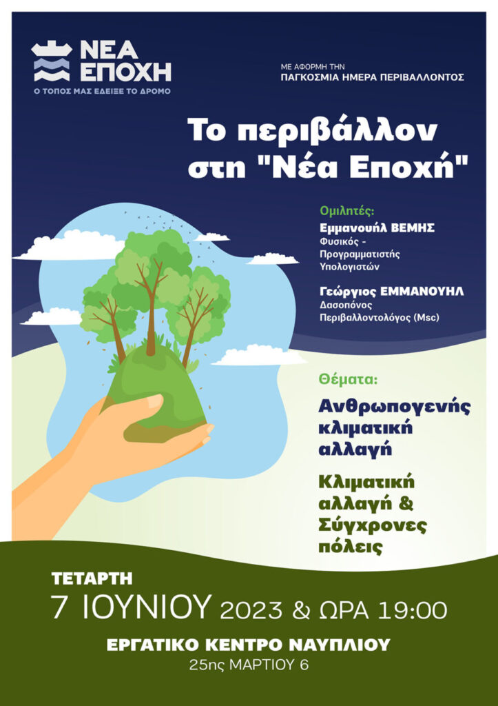Στα πλαίσια του εορτασμού της Παγκόσμιας Ημέρας Περιβάλλοντος 2023 και με στόχο την ευαισθητοποίηση της κοινωνίας του δήμου Ναυπλιέων, το γραφείο επικοινωνίας του συνδυασμού «ΝΕΑ ΕΠΟΧΗ» με επικεφαλής τον υποψήφιο Δήμαρχο Ναυπλιέων κ. Κωνσταντίνο ΜΑΚΑΡΗ, διοργανώνει ομιλία με θέμα: