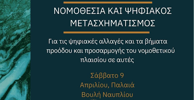 Ο Δήμος Ναυπλιέων συνδιοργανώνει με το Διεθνές Ινστιτούτο για την Κυβερνοασφάλεια “CSI Institute” υπό την αιγίδα του Υπουργείου Ψηφιακής Διακυβέρνησης και της Εισαγγελίας Πρωτοδικών Ναυπλίου το Σάββατο 9 Απριλίου και ώρα 10.30 στην αίθουσα της Παλαιάς Βουλής Συνέδριο με θέμα «Νομοθεσία και Ψηφιακός Μετασχηματισμός. Για τις ψηφιακές αλλαγές και τα βήματα προόδου και προσαρμογής του νομοθετικού πλαισίου σε αυτές».