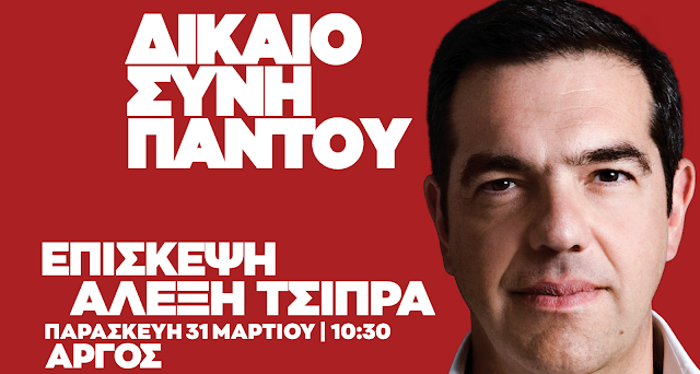 Ο πρόεδρος του ΣΥΡΙΖΑ – Προοδευτική Συμμαχία, Αλέξης Τσίπρας, την Παρασκευή 31 Μαρτίου, θα περιοδεύσει στο νομό Αργολίδας και θα πραγματοποιήσει ομιλία στην Καλαμάτα. Ακολουθεί το αναλυτικό πρόγραμμα: