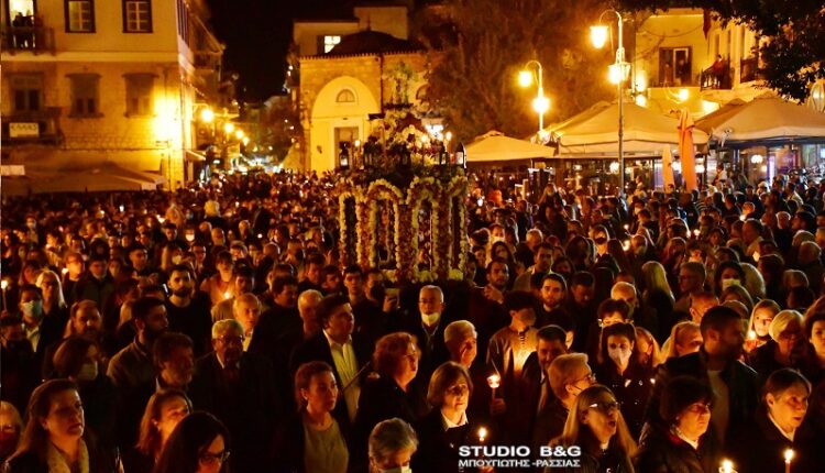 Ένα τεράστιο ποτάμι από πιστούς κατέκλυσε την ιστορική πλατεία Συντάγματος στο Ναύπλιο τη Μεγάλη Παρασκευή 22 Απριλίου 2022 κατά την συνάντηση των επιτάφιων. Κάθε χρόνο συγκεντρώνονται χιλιάδες ντόπιοι και επισκέπτες για να παρακολουθήσουν την κατανυκτική αυτή τελετή. Οι περιφορές των επιταφίων της Μεγάλης Παρασκευής στο ιστορικό κέντρο του Ναυπλίου έχουν διαφορετικό χρώμα και ακολουθούν κάποιου είδους ιεροτελεστία που κάνουν το γεγονός πιο εντυπωσιακό. Οι πομπές των επιταφίων βγαίνουν με καθορισμένη σειρά από κάθε Ναό και συναντώνται στο κέντρο της πόλης, στην πλατεία Συντάγματος. Σε όλη τη διαδρομή ο δήμος Ναυπλιέων είχε τοποθετήσει αναμμένα κεριά, ενώ η φιλαρμονική του ΔΟΠΠΑΤ συνόδευε παίζοντας πένθιμα εμβατήρια ,υπό την διεύθυνση του μαέστρου Θεοδόση Αντωνιάδη. Οι επιτάφιοι που συναντήθηκαν ήταν του Μητροπολιτικού Ιερού ναού του Αγίου Γεωργίου και της Ιστορικής εκκλησίας Παναγίας. Η τελετή πραγματοποιήθηκε προεξάρχοντος του Μητροπολίτη Αργολίδος Νεκτάριου. Πιο νωρίς έγινε η ακολουθία του Επιτάφιου στον Μητροπολιτικό ναό του Αγίου Γεωργίου χοροστατούντος του Μητ